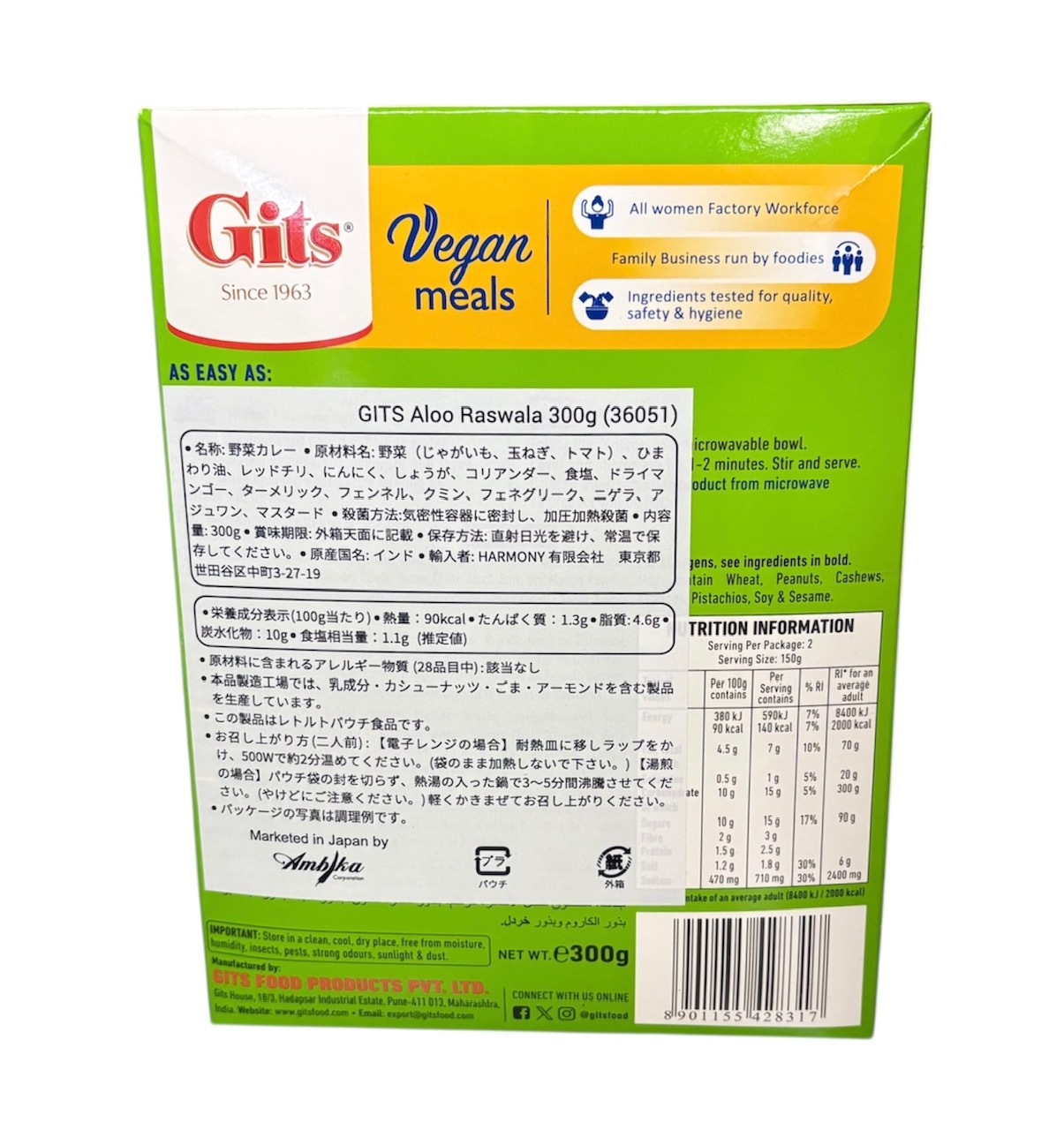 野菜(じゃがいも、玉ねぎ、トマト)、ひまわり油、レッドチリ、にんにく、しょうが、コリアンダー、食塩、ドライマンゴー、
