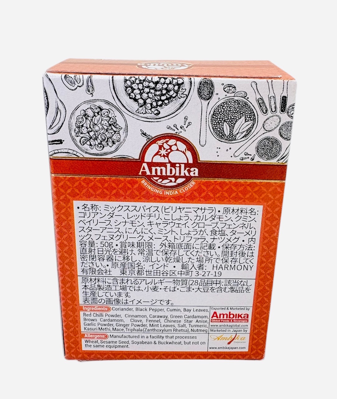 コリアンダー、レ ッドチリ、こしょう、カルダモン、クミン、ベイリーフ、シナモン、キャラウェイ、クローブ、フェンネル、スターアニス、にんにく、ミント、しょうが、食塩、ター メリック、フェヌグリーク、メース、テッパル、ナツメグ